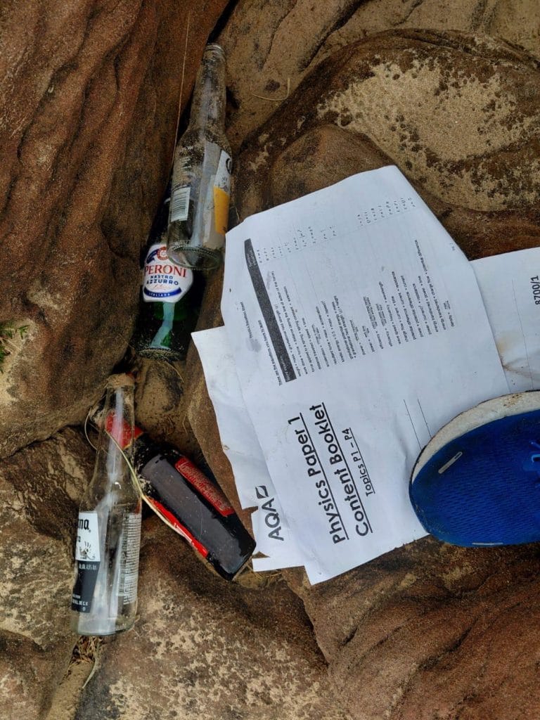 “We also found GCSE papers, unfortunately without names on them, but it seems clear that after their exams these kids, who presumably are 16-years-old, decided to celebrate by throwing bottles at the rocks. Dog walking can’t happen here now because they will be cutting their feet, it only takes a tiny slither.