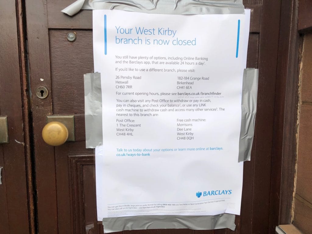 Lloyds and Santander shut their West Kirby branches in 2019, and the departure of Barclays means NatWest is now the sole bank in the area.