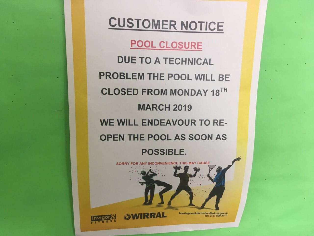 Wirral Council say it will not re-open for "a minimum of two weeks" and Swim Wirral - which runs lessons for children at the Concourse - has contacted parents cancelling sessions for the next few weeks.