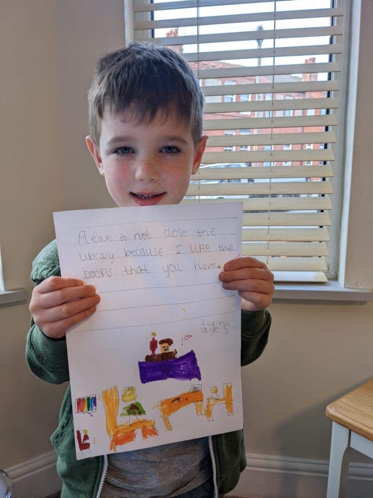 Among those who want the library to stay open is five year-old Liam Philip (pictured above), who has drawn a poster calling for the library to stay open because he enjoys borrowing and reading its books.