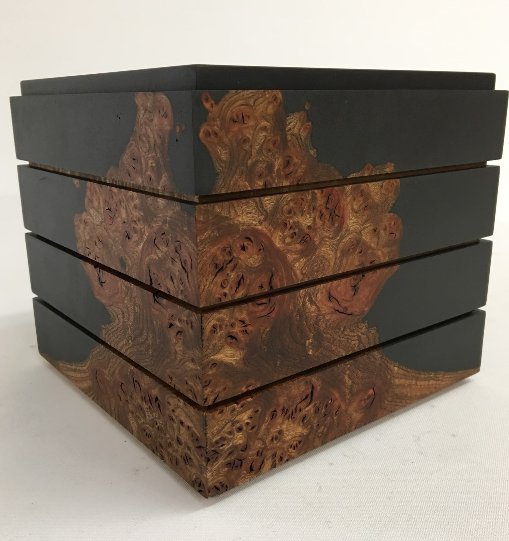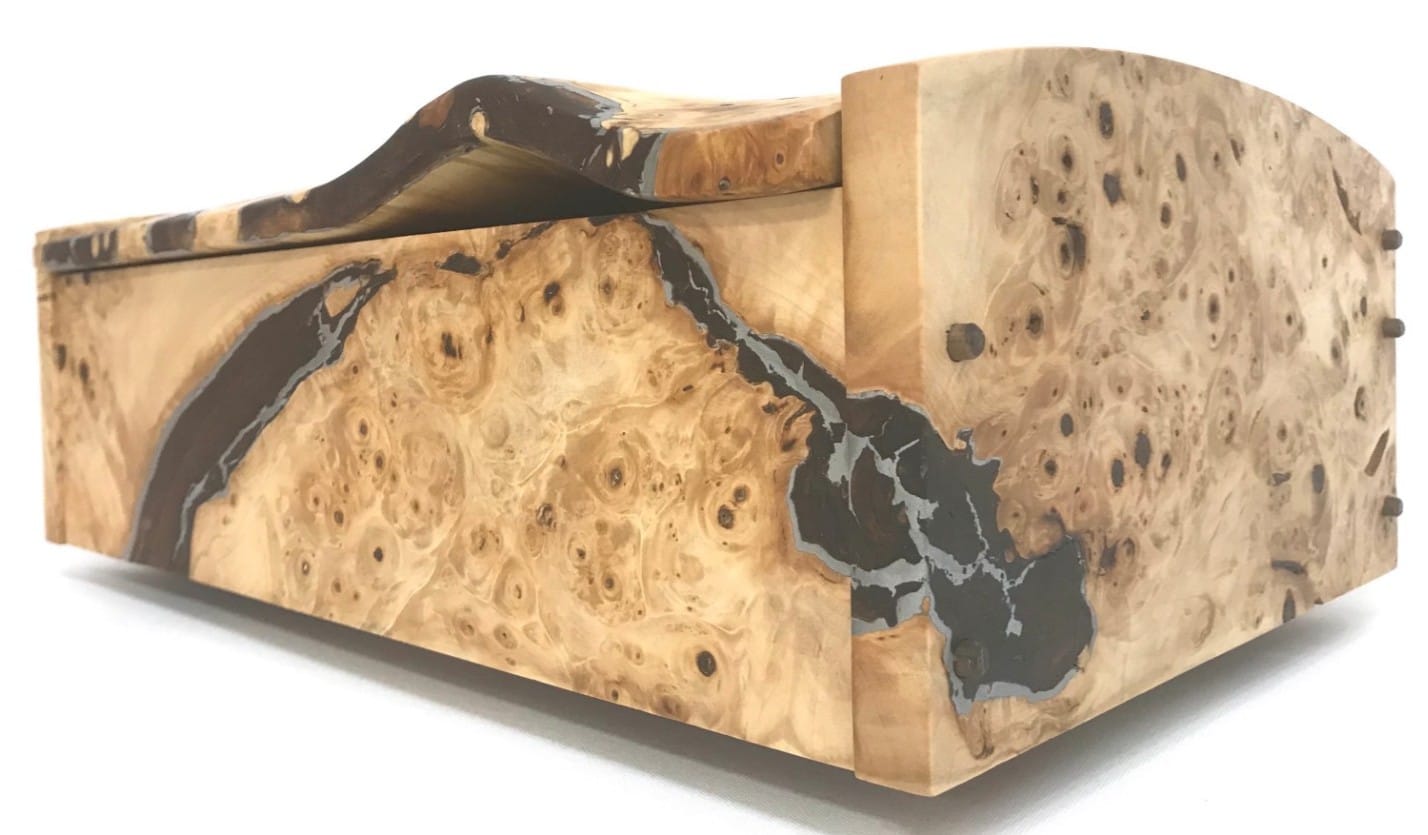 Jonathon produces contemporary pieces from British timbers. His work is material led and he enjoys seeking out unusual and distinctive native woods which often go to waste in traditional cabinetry. His boxes are produced to emphasise and exploit the unique beauty and the natural faults within the timbers. By combining resin casting processes and traditional joinery techniques he is able to produce fascinating and elegant boxes.