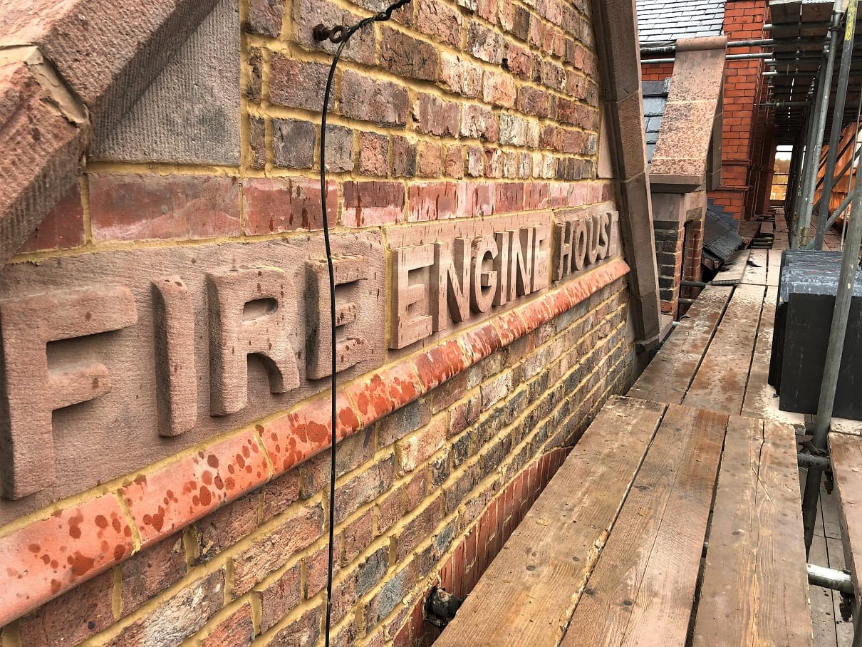 Exterior shots show the original Council District Offices sign, both in brick and in ornate carved sandstone, original and new roof slates, as well as original architectural features .