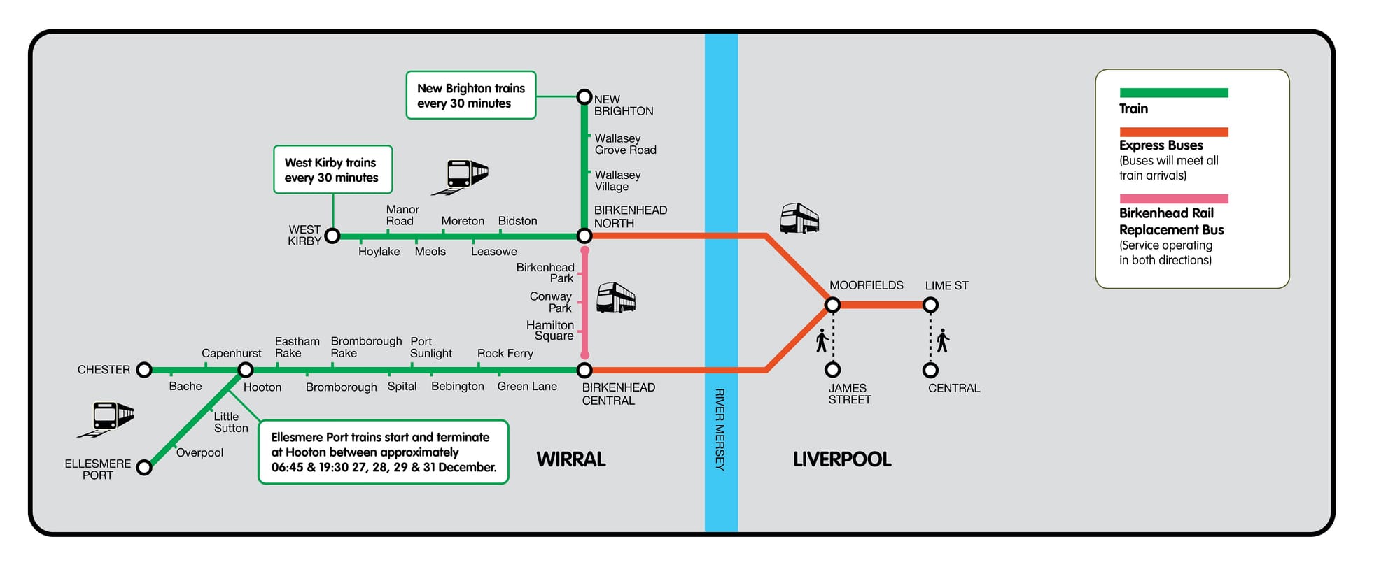 Rail replacement bus services will take passengers over to the city centre, and there will be a shuttle bus operating between Birkenhead North, Birkenhead Park, Conway Park, Hamilton Square and Birkenhead Central stations.