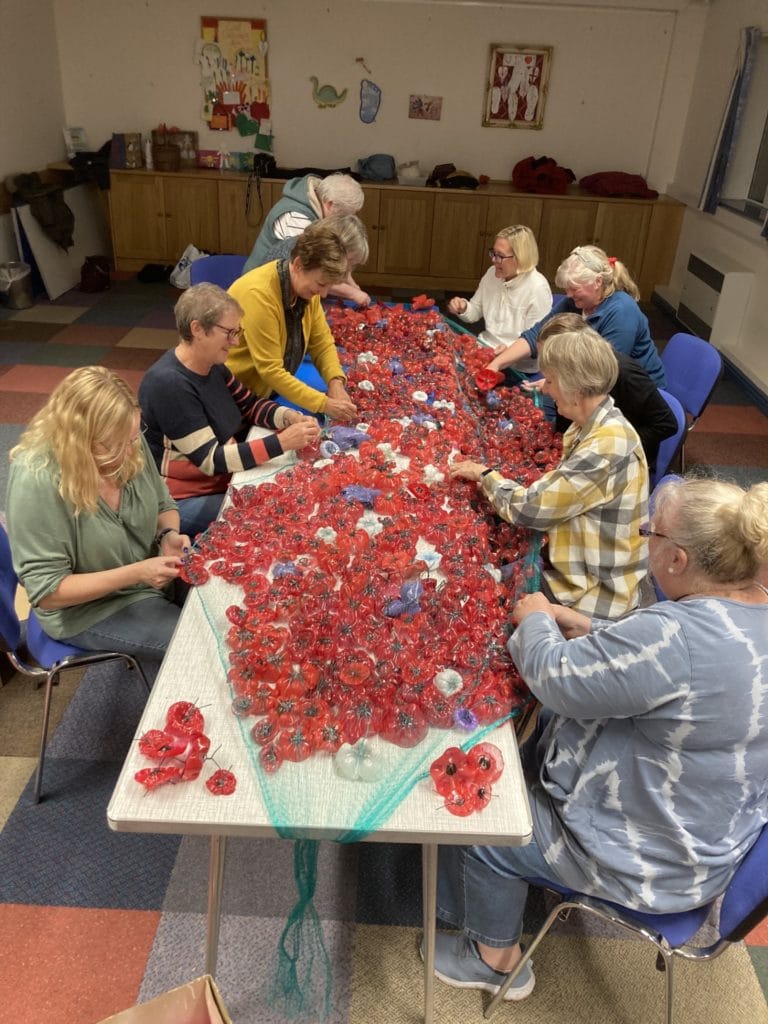 The tops and bottoms of plastic pop bottles were saved by members of WI, church congregation and FB followers. A number of West Kirby WI’s All Things Crafty subgroup then cut and shaped them before spraying them. The poppies were then curled using a heat source.