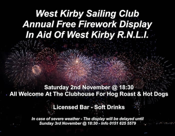 West Kirby Sailing Club will run its annual fireworks display on Saturday 2nd November, starting at 18.30.