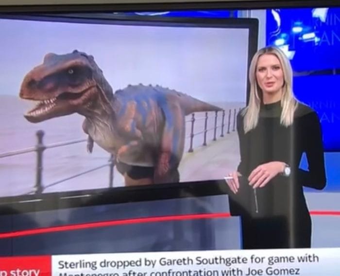 It's been a familiar, if somewhat unexpected sight, over the past month - a moustachioed T-Rex walking around West Kirby Marine Lake.