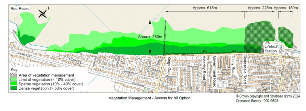 The ‘Access for All’ option proposes the removal of 1.92 hectares of vegetation primarily around the RNLI lifeboat station, but also including the slipways at King’s Gap, Alderley Road, and Trinity Road; a 10m wide strip along the seawall from Clydesdale Road to King’s Gap extending around the Alderley Road slipway and Trinity Road steps and a 10m wide cleared strip from King’s Gap through the vegetation to the sandy beach.