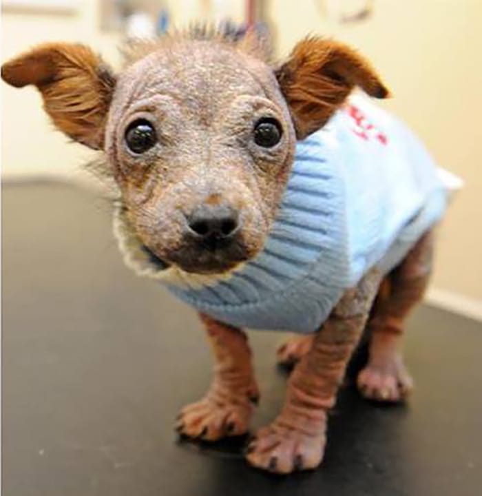 Shivering, mite ridden, and with barely any hair, the Jack Russell/Chihuahua cross was brought to West Kirby vet, Tom McGowan, who works for Willows Veterinary Group which runs the Acorn surgery.